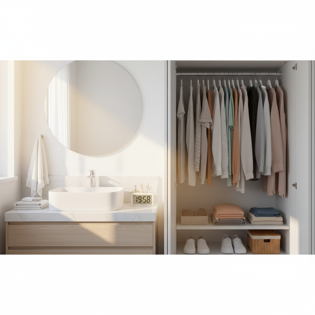 もう1つ大きかったのが、道具を手順に合わせて置くことです。たとえば衣類ケア用品や充電ケーブルが毎回違う場所にあるだけで、体感ではかなり疲れます。見える場所に置く、定位置を作る、それだけで朝のストレスが減って、結果的に朝 支度 時短の改善につながりました。